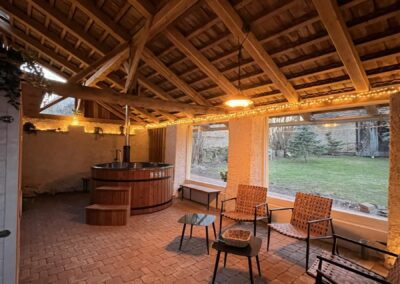 Na otevřenou kuchyň navazuje formanka (společenská místnost) s krbovými kamny a hracím koutem pro děti. Místnost slouží jako jídelna s 30 místy k sezení (uspořádání tabule, do U, samostatně).